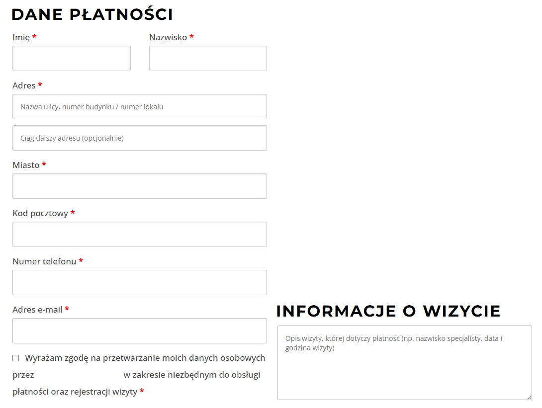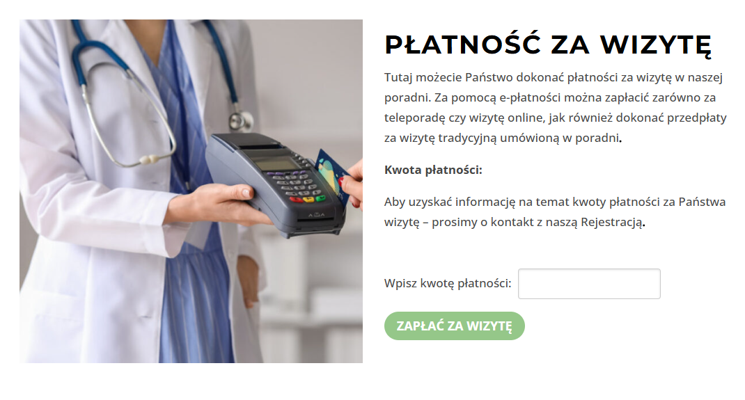 Użytkownik wchodzi na stronę z możliwością opłacenia wizyty. Od razu widzi pole, w którym może wpisać kwotę, jaką chce zapłacić. Może to być stała cena lub kwota, którą sam ustali – na przykład przy dopłacie czy przedpłacie. Po wpisaniu wartości klika przycisk „Zapłać za wizytę”, co przenosi go dalej.