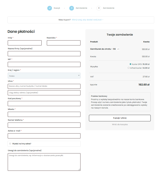 Wypełnij poniższy formularz swoimi danymi potrzebnymi do realizacji płatności i dostawy. Upewnij się, że podane informacje są poprawne, aby uniknąć opóźnień w realizacji zamówienia.